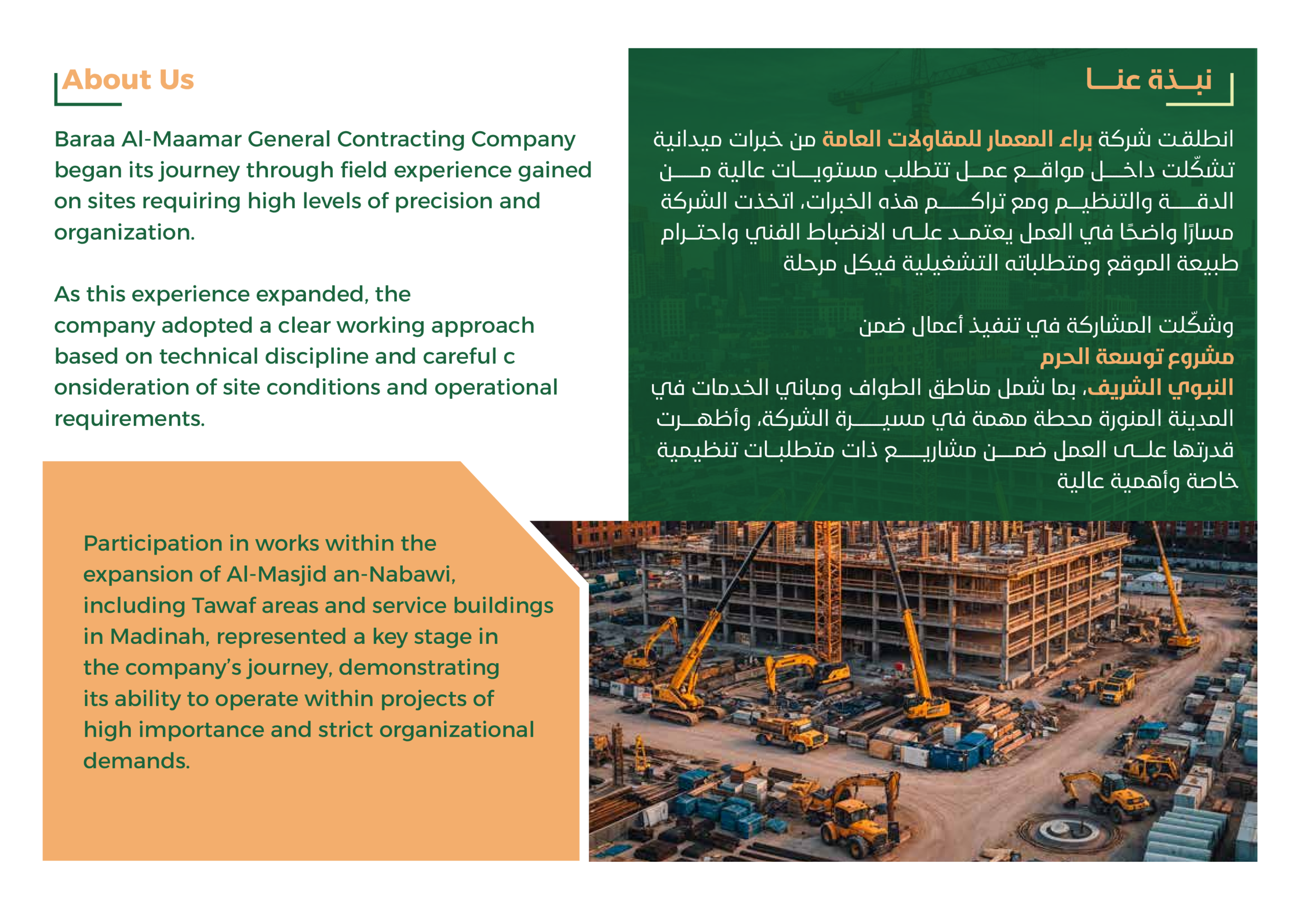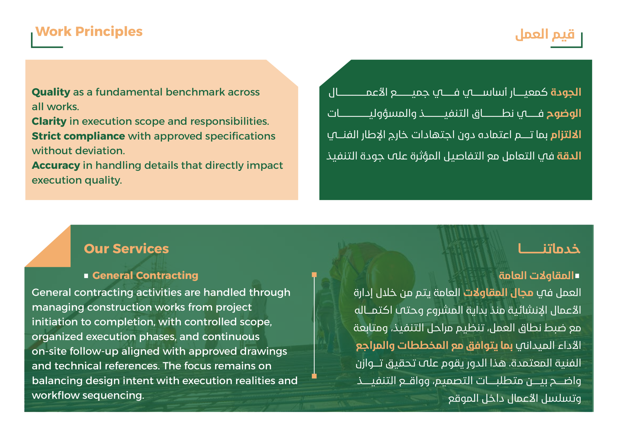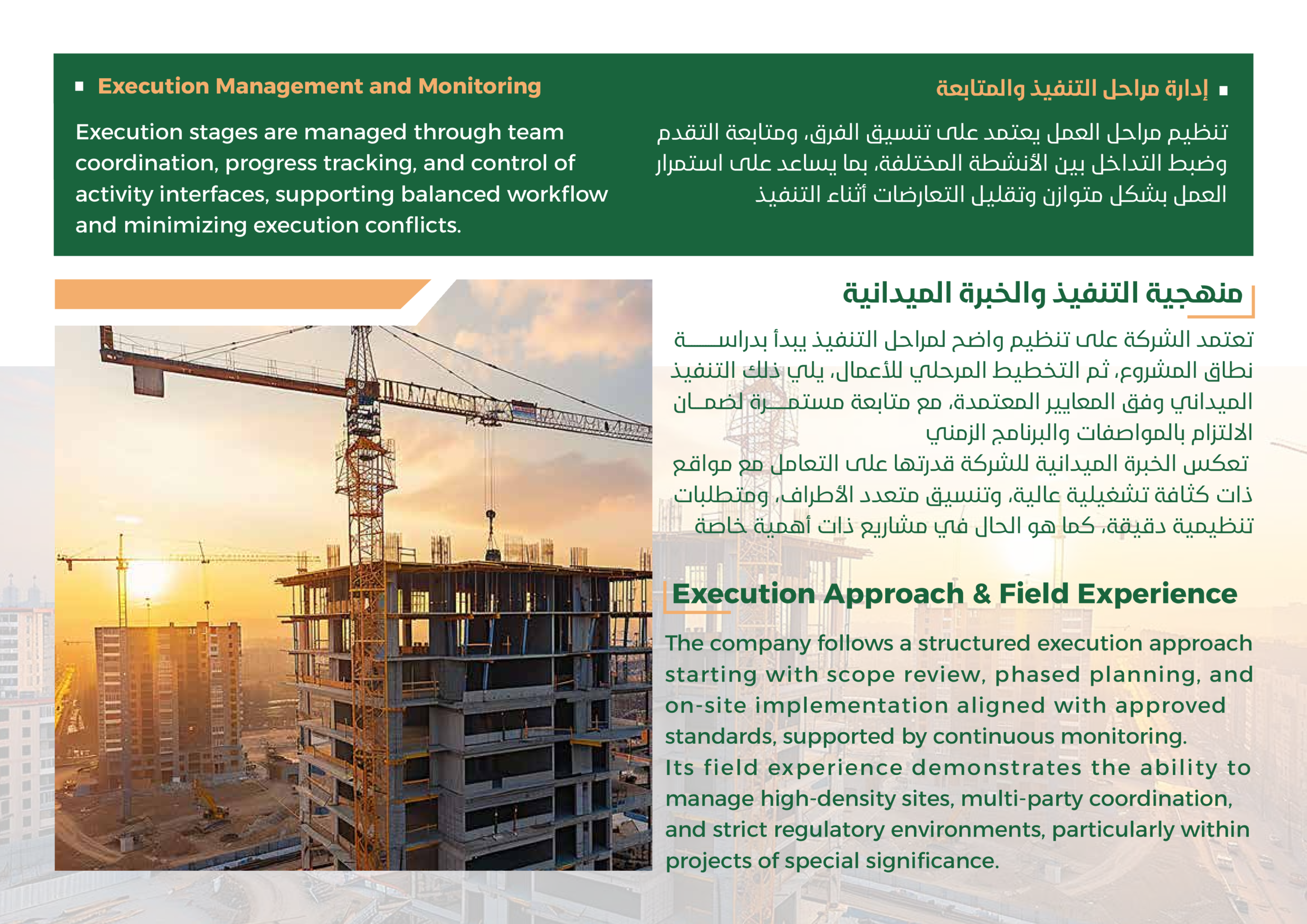 يعتمد تصميم البروفايل على هوية بصرية واضحة بألوان تعكس الطابع العمراني والإنشائي، مع دمج صور ميدانية ومشاهد حضرية تعزّز الإحساس بالواقعية والقوة. تنسيق المحتوى جاء منظمًا ومتوازنًا ليبرز رؤية الشركة وخدماتها ومشروعاتها بشكل احترافي يعكس الالتزام بالجودة ودقة التنفيذ. التصميم يمنح انطباعًا بالثقة والجاهزية لتنفيذ المشاريع على مختلف المستويات.