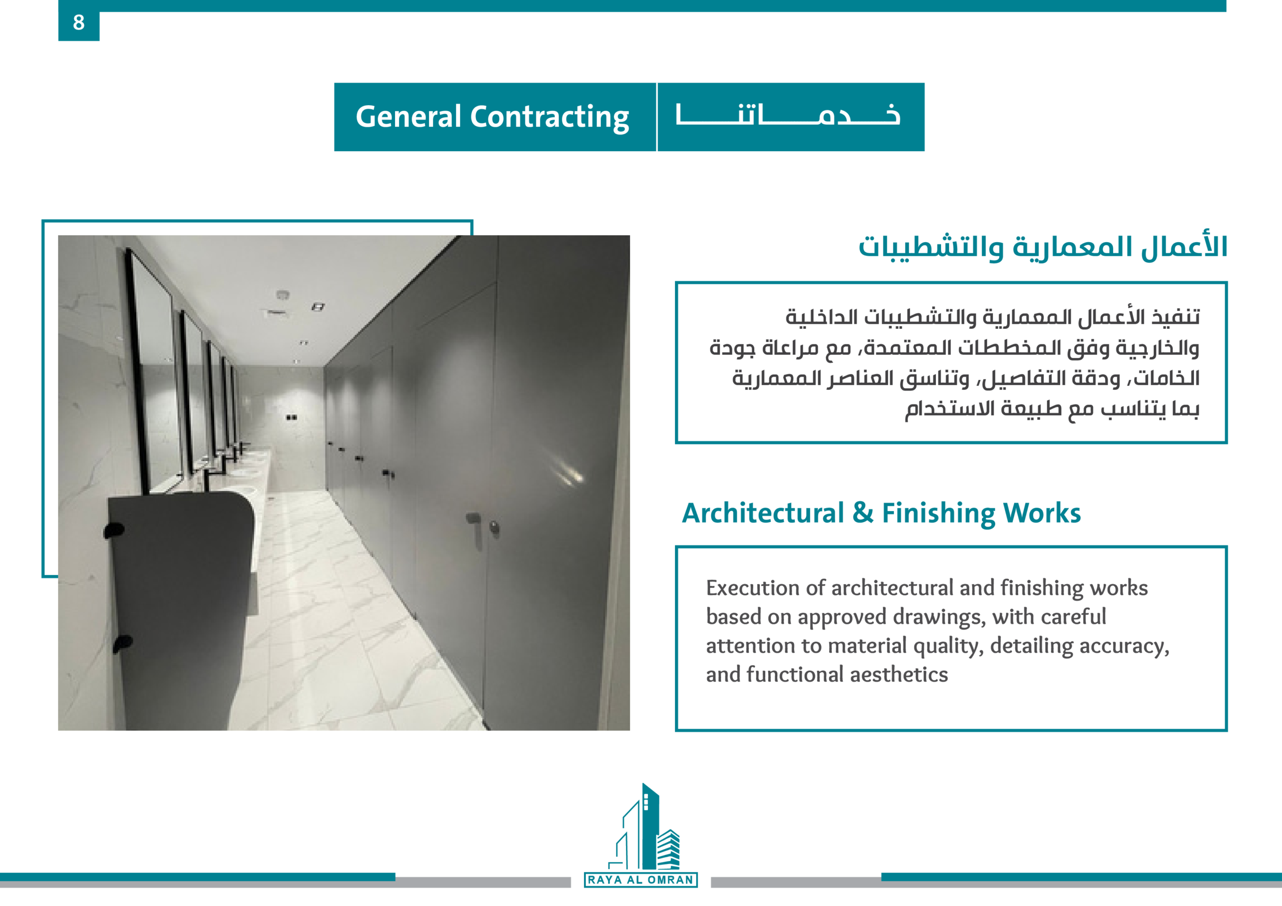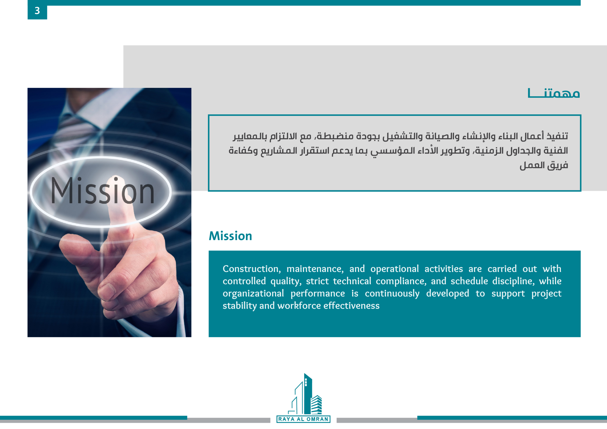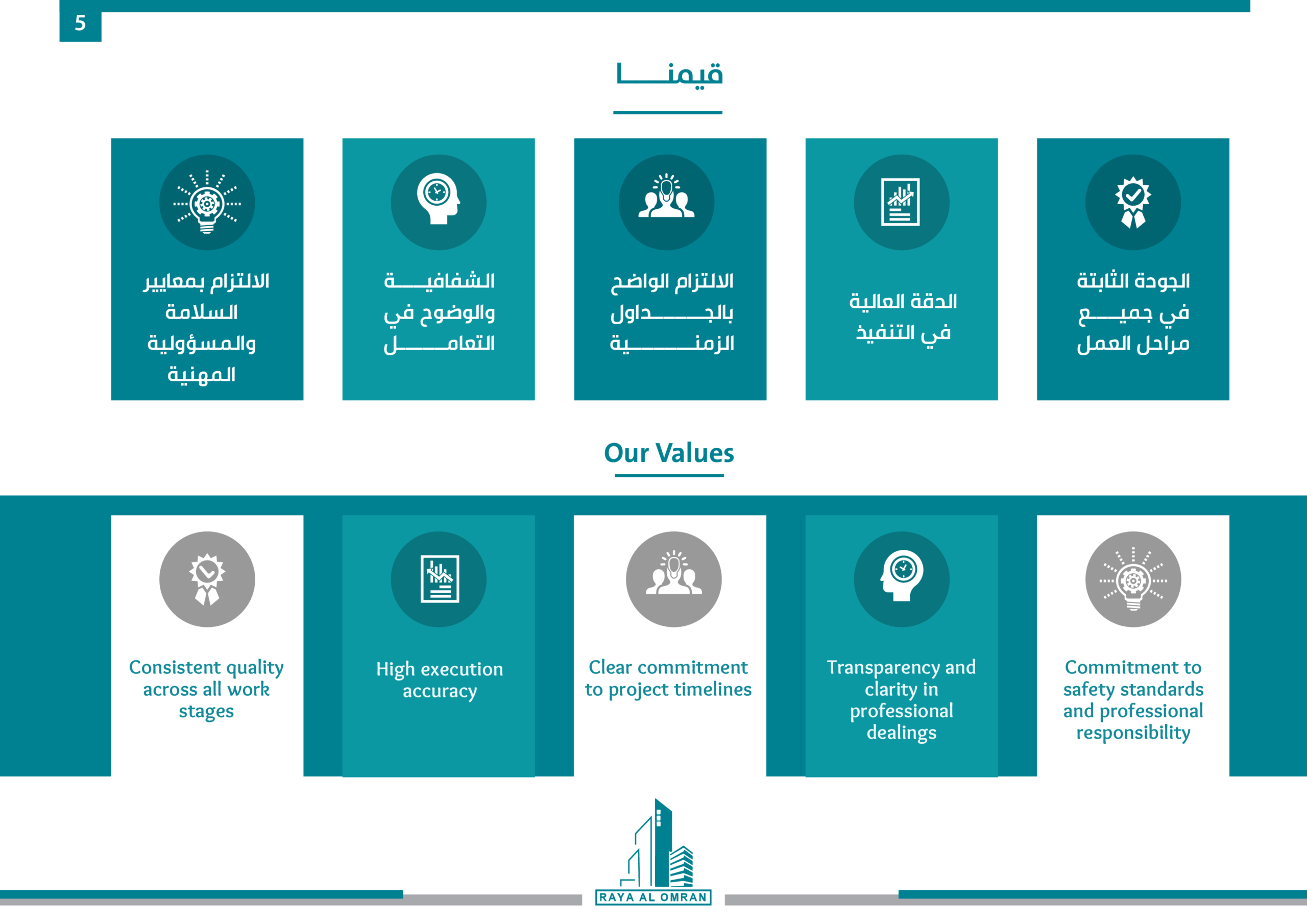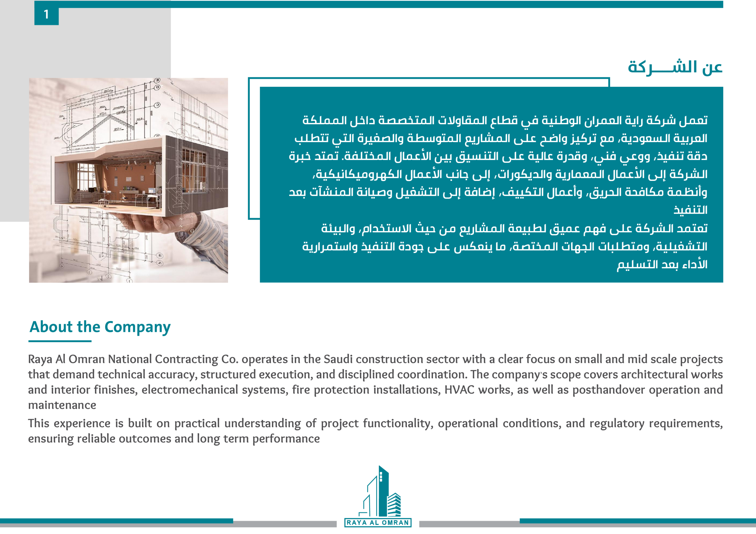 تم تصميم البروفايل بأسلوب عصري يعتمد على خطوط نظيفة وتكوين هندسي متوازن يعكس طبيعة القطاع الإنشائي. استخدام الألوان المؤسسية مع الصور المعمارية يعزز الإحساس بالقوة والثبات، بينما يبرز تنسيق المحتوى بشكل منظم رؤية الشركة وخدماتها ومشروعاتها. التصميم يقدّم انطباعًا احترافيًا يعكس الثقة والالتزام والجودة في التنفيذ.