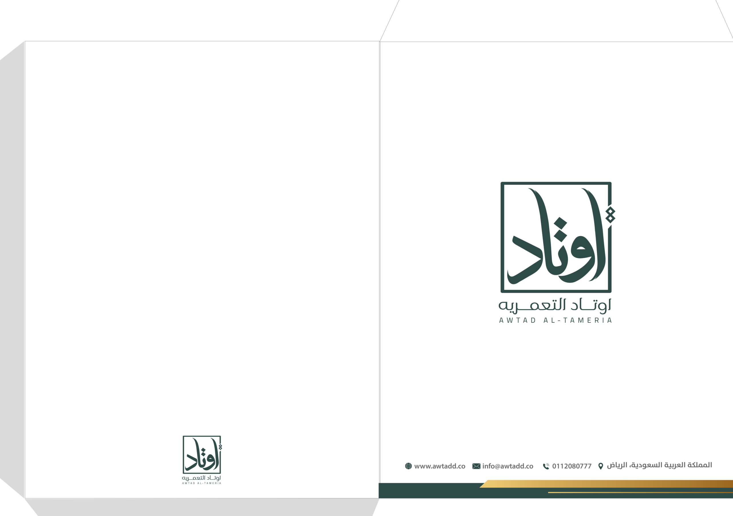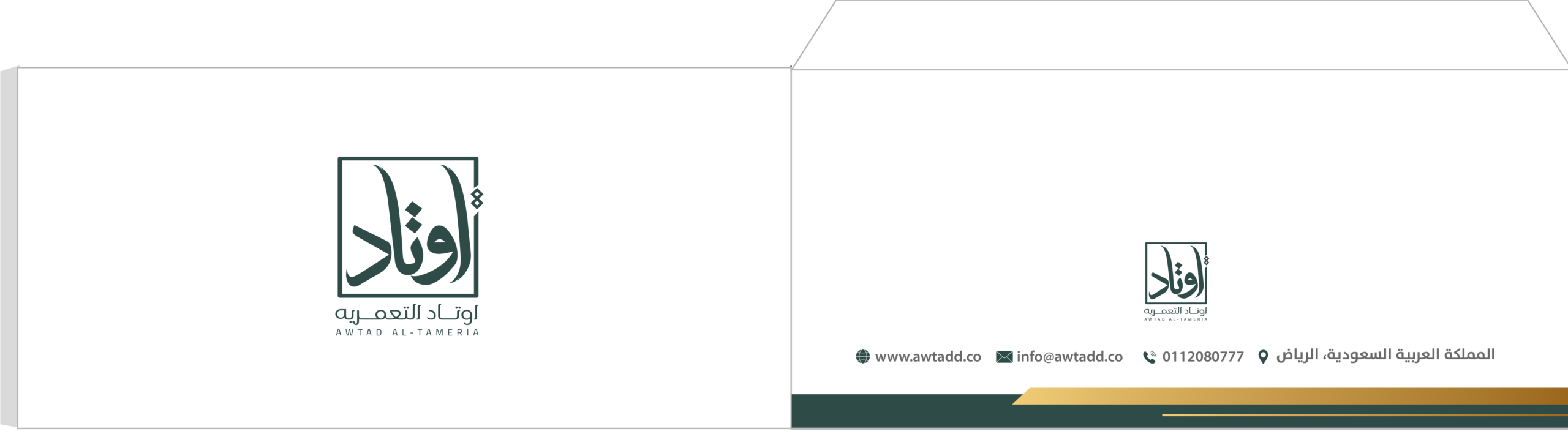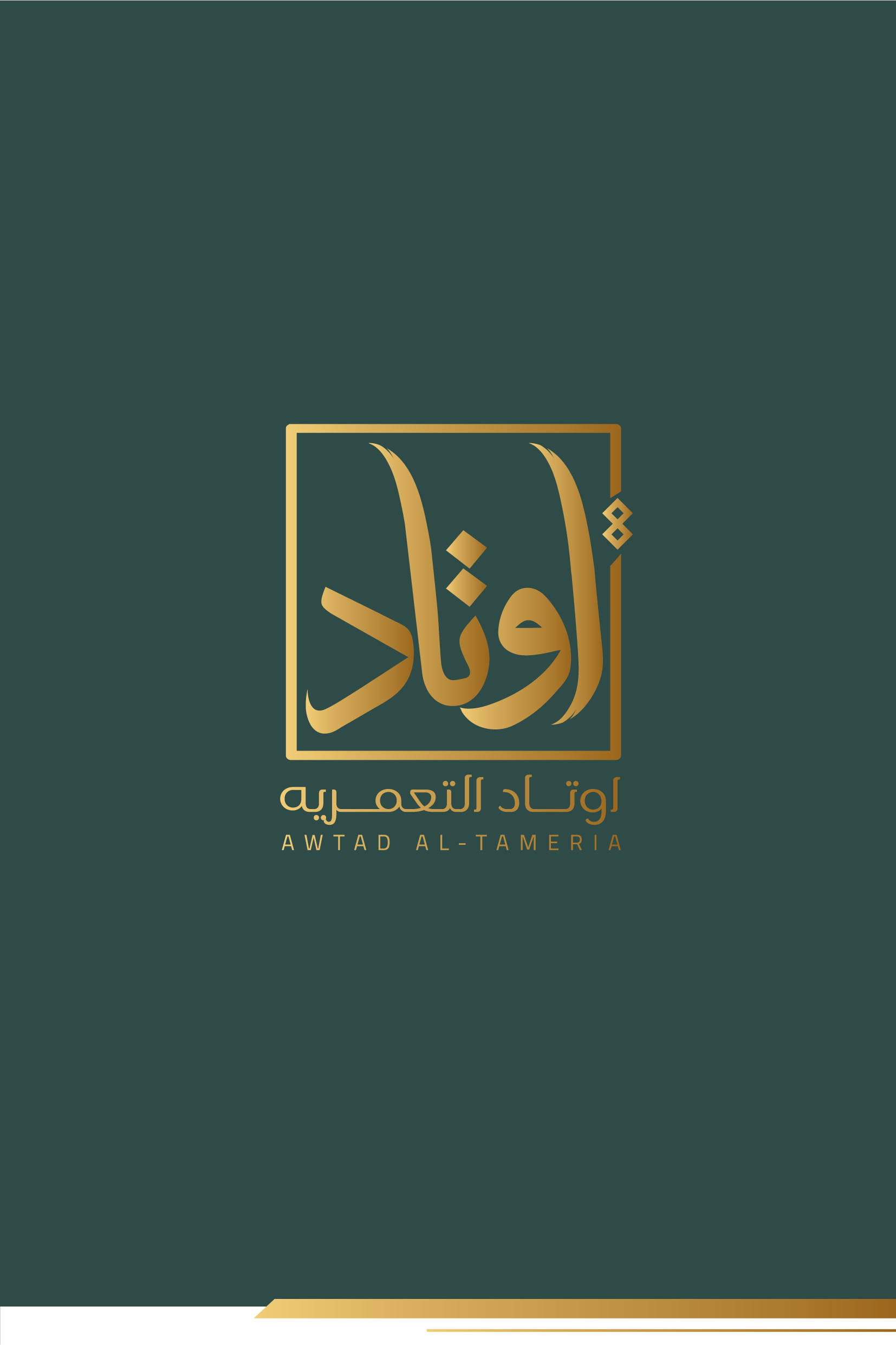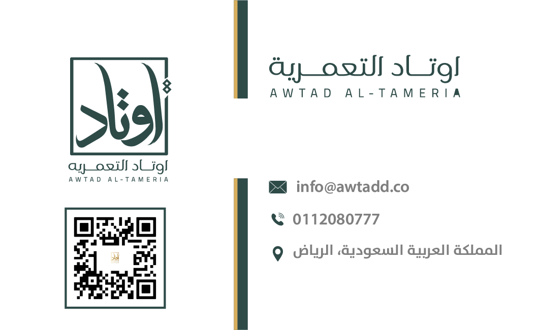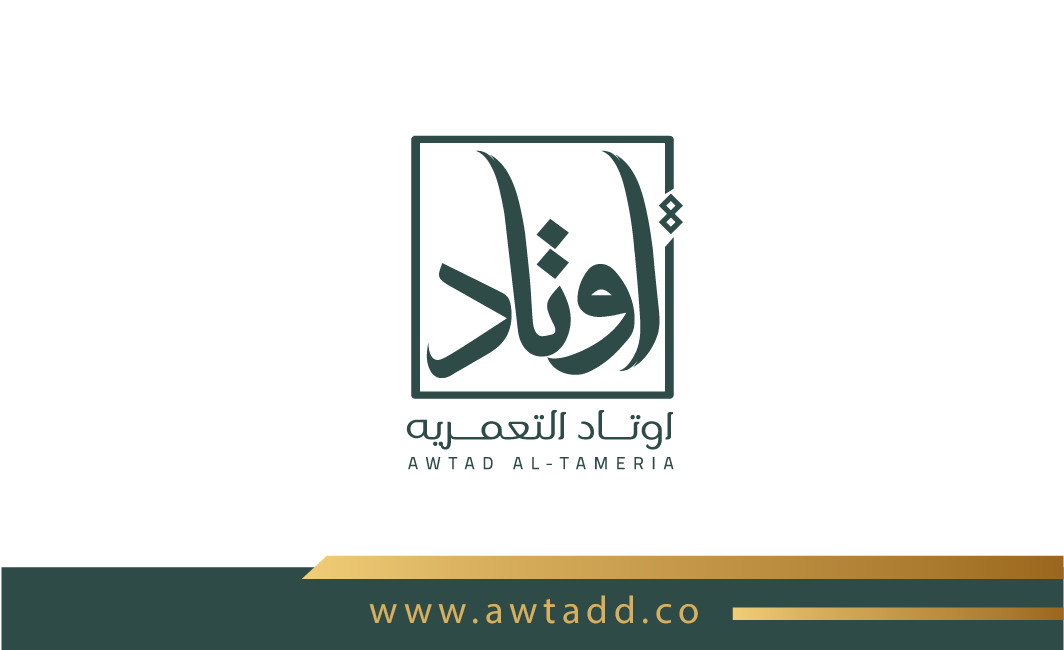 تعتمد الهوية على توازن لوني بين الأخضر الداكن والذهبي، ما يمنحها إحساسًا بالفخامة والثقة. الشعار جاء بخط عربي مميز داخل إطار هندسي يعزز مفهوم الثبات والارتكاز، في إشارة مباشرة لمعنى “الأوتاد”. الدمج بين العربية والإنجليزية يعكس هوية حديثة قادرة على الحضور محليًا ودوليًا، بينما يمنح الأسلوب العام انطباعًا بالاحتراف والجدية والرسوخ في قطاع الأعمال.