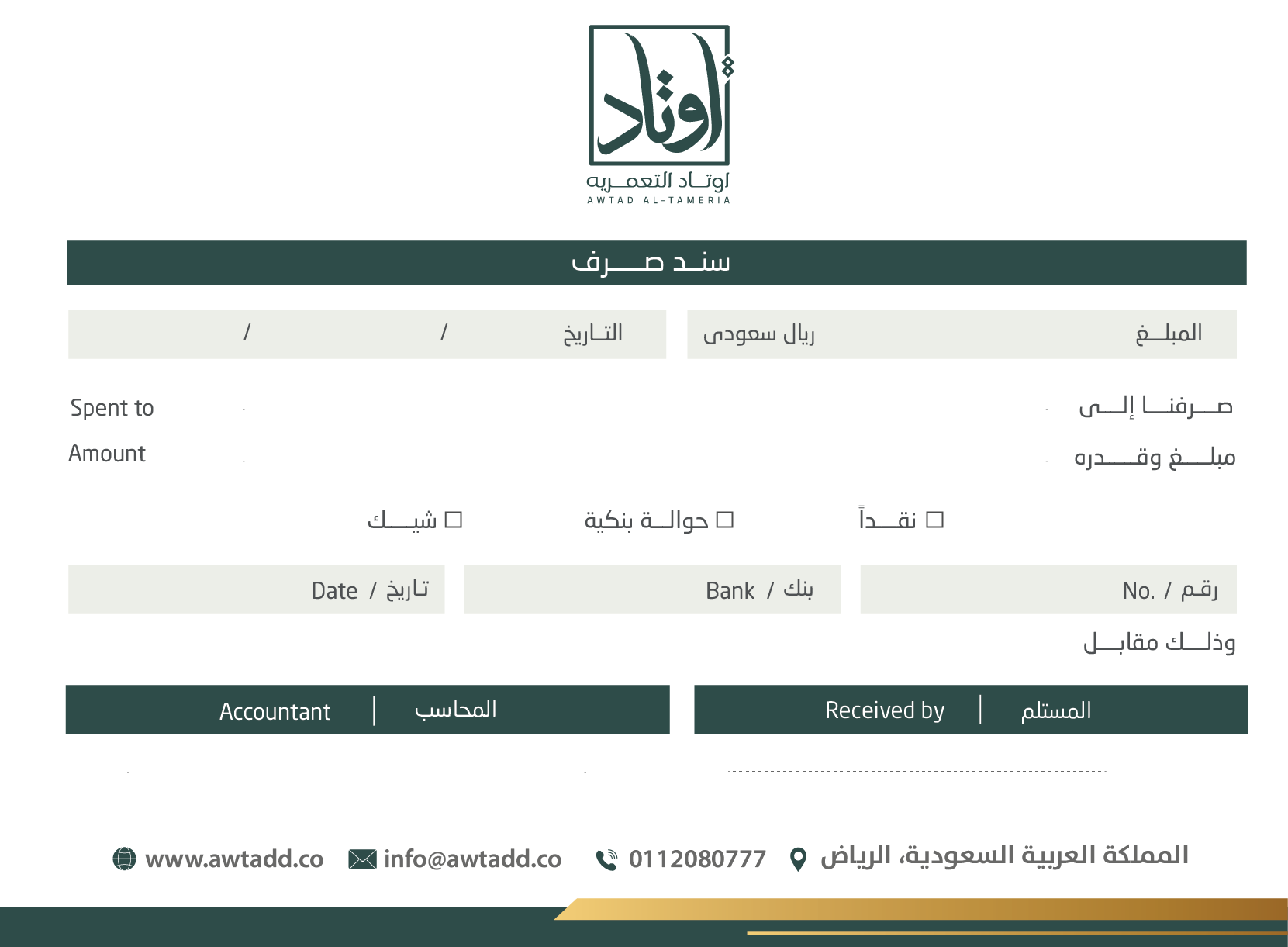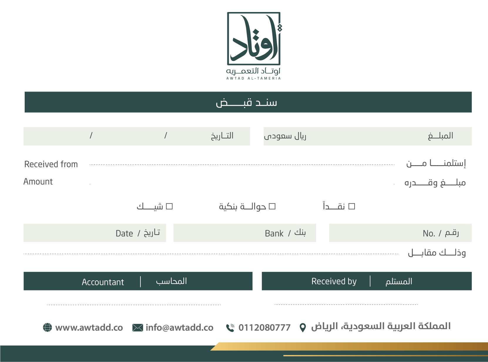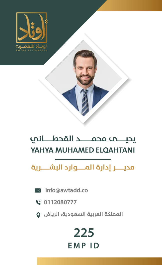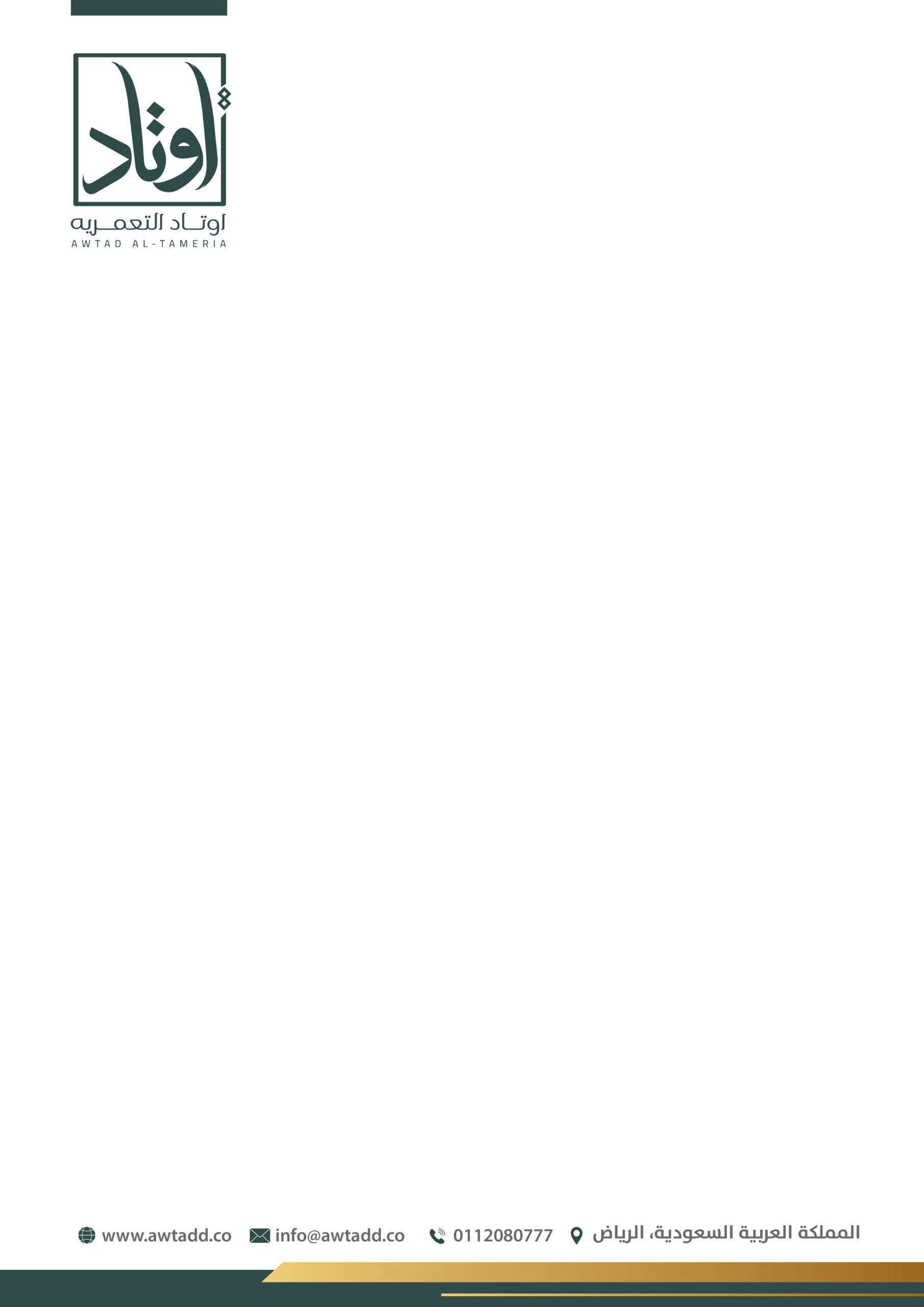 تعتمد الهوية على توازن لوني بين الأخضر الداكن والذهبي، ما يمنحها إحساسًا بالفخامة والثقة. الشعار جاء بخط عربي مميز داخل إطار هندسي يعزز مفهوم الثبات والارتكاز، في إشارة مباشرة لمعنى “الأوتاد”. الدمج بين العربية والإنجليزية يعكس هوية حديثة قادرة على الحضور محليًا ودوليًا، بينما يمنح الأسلوب العام انطباعًا بالاحتراف والجدية والرسوخ في قطاع الأعمال.