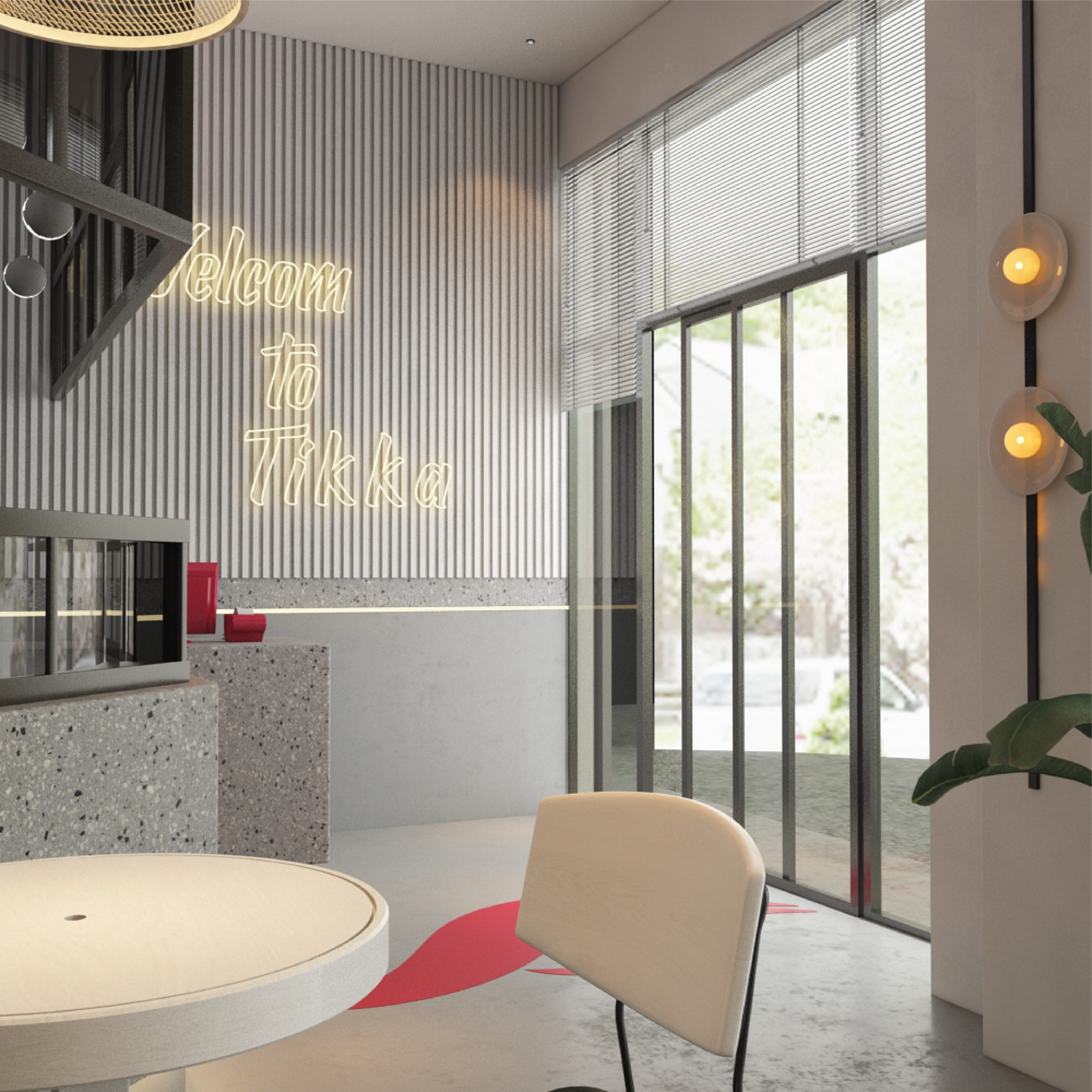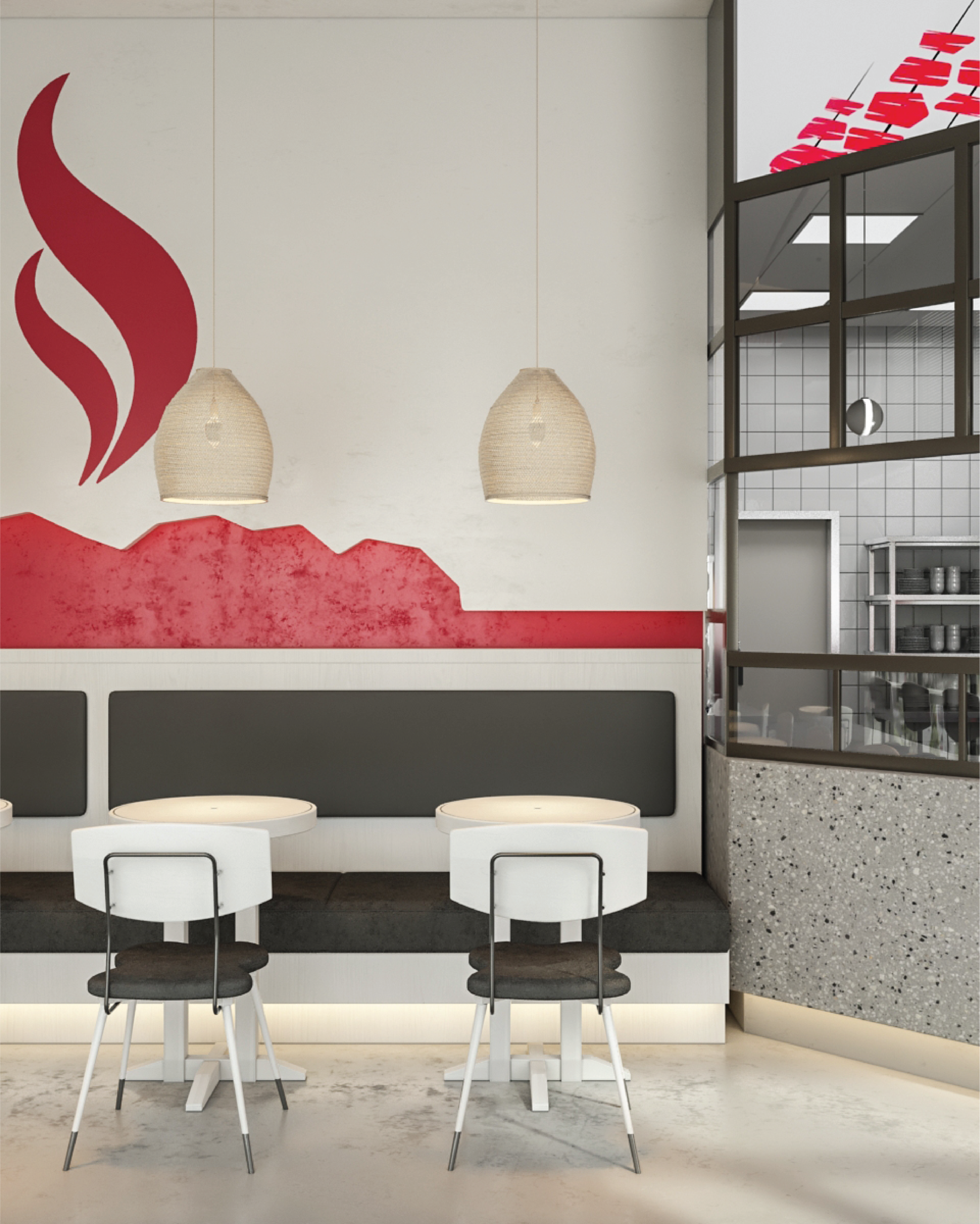 يعتمد التصميم على واجهة نظيفة بخطوط واضحة وألوان دافئة مستوحاة من نكهة الأكل، مع إبراز الاسم باللغتين العربية والإنجليزية لتعزيز الهوية. استخدام الزجاج الشفاف مع عناصر تصميمية رمزية يخلق تواصلًا بصريًا مباشرًا مع الداخل، بينما تضيف الإضاءة الهادئة لمسة عصرية تعكس احترافية العلامة وتجربة مطعم منظمة وجذابة.